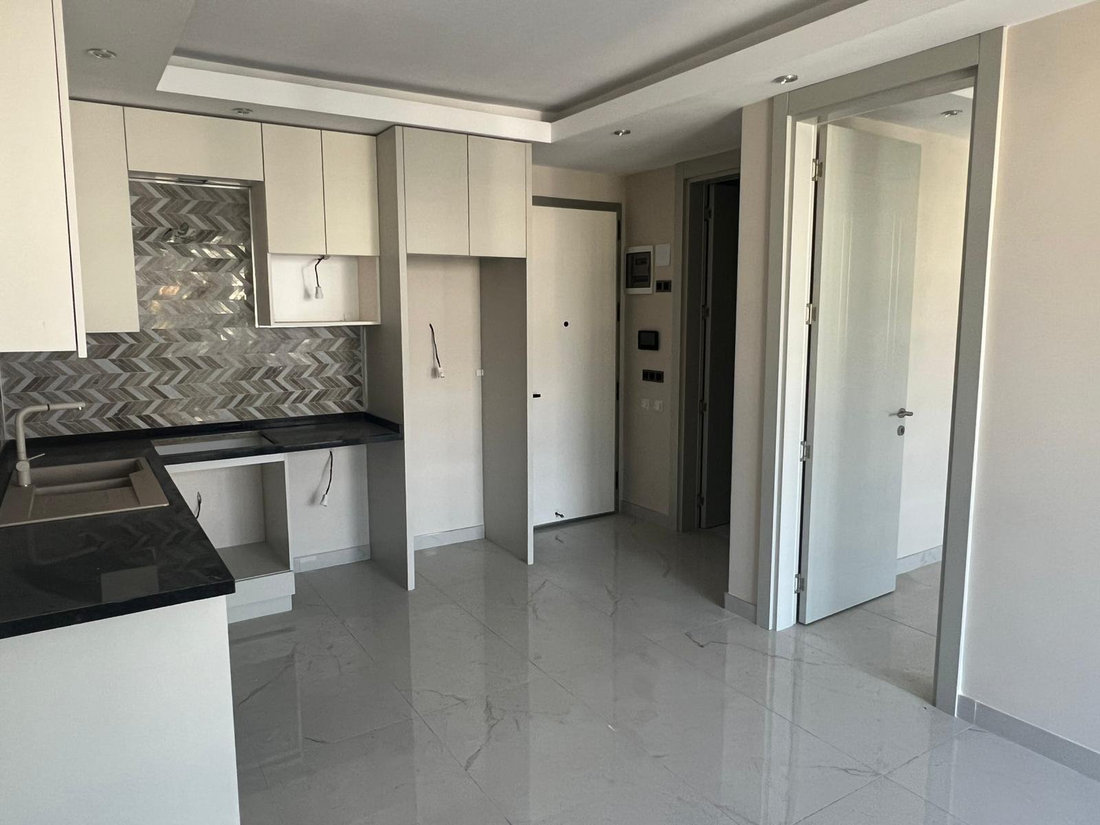 The apartment features a functional 1+1 layout with a bright living area, open-plan kitchen, separate bedroom and balcony. It is brand new and has never been occupied, offering a clean finish and a neutral interior that can be easily adapted to different needs. Large windows provide natural light and enhance the sense of space.