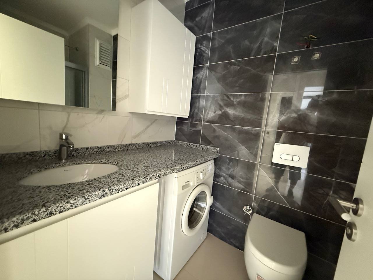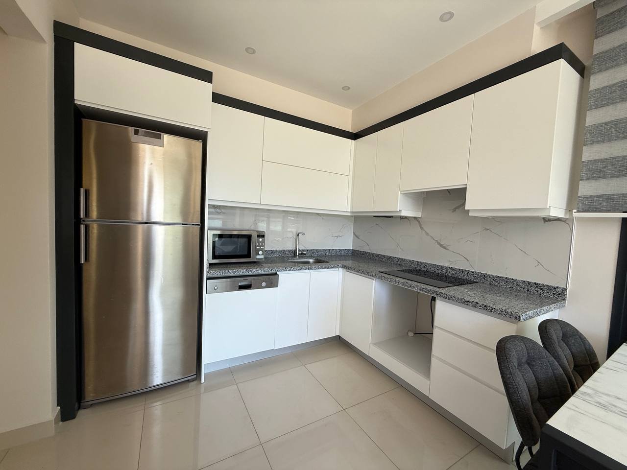 The 1+1 apartment with a total area of 50 m² is situated on the 2nd floor and comes fully furnished with household appliances 🛋. The stylish interior in light tones features a cozy bedroom, a spacious living room, a modern kitchen with a granite countertop, and a balcony offering stunning views of the mountains and the complex’s grounds.