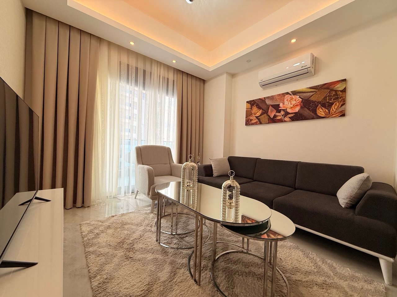 This stylish 1+1 furnished apartment is an excellent opportunity for living, investment or rental income in Mahmutlar. The spacious 55 m² layout, modern interior, high floor location and access to premium facilities — pools, sauna, hammam, gym, landscaped areas and security — make the property highly attractive.