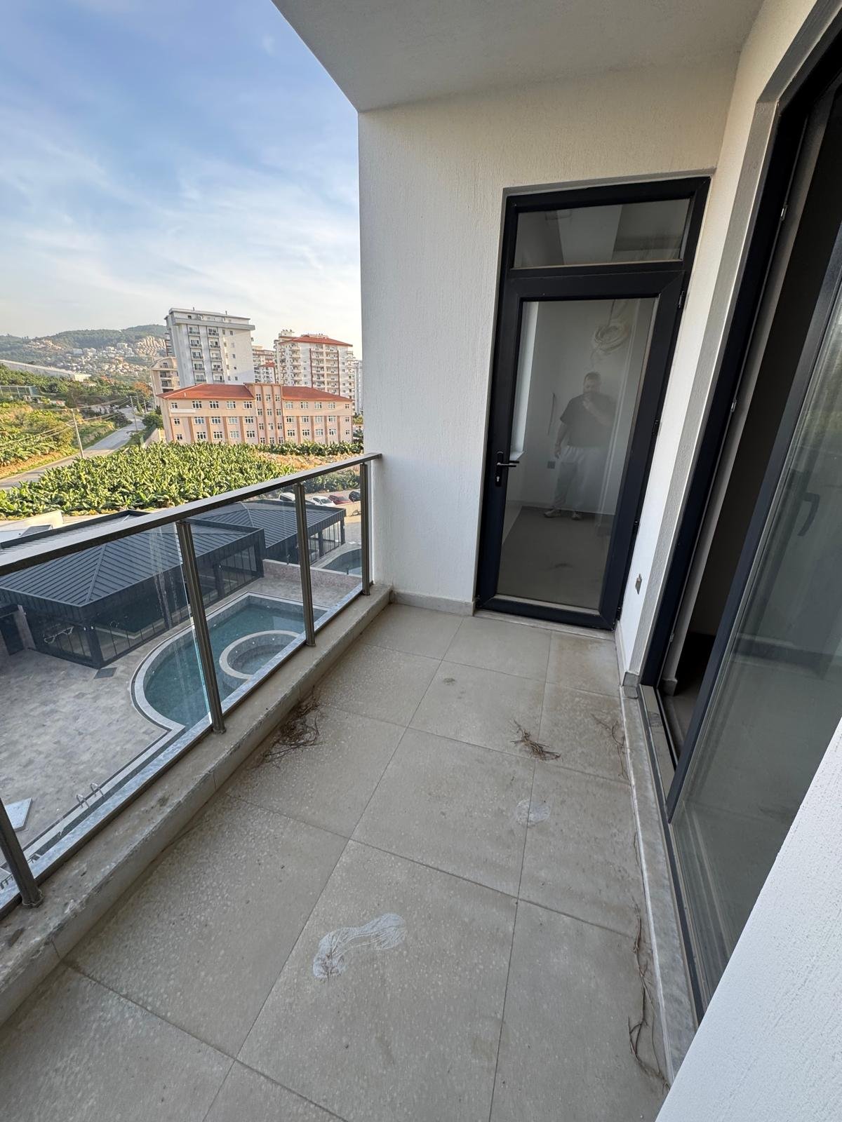 The apartment has a functional 50 m² layout featuring an open-plan living room with a kitchen, a separate bedroom, a modern bathroom, and a balcony overlooking the complex territory and mountain views. Located on the 3rd floor, the apartment is delivered with clean finishing and has never been occupied. Interior features include granite kitchen countertops, spot lighting, decorative ceilings, reinforced entrance door, and double-glazed PVC windows.
