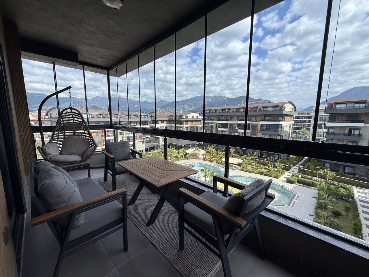 The apartment is located on the 4th–5th floors and includes a spacious living room with open kitchen, four bedrooms, two bathrooms and balconies. Total area — 180 sqm. The property is sold fully furnished and equipped.